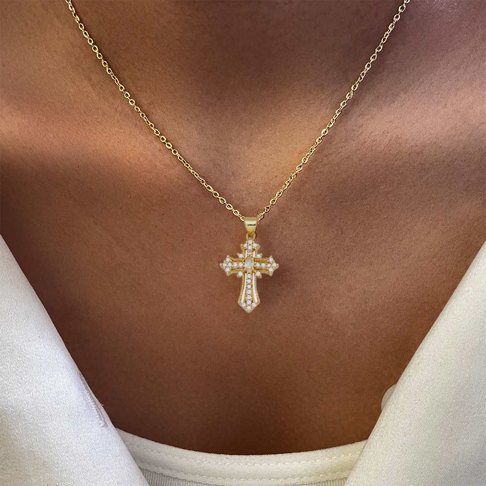 Adorned with a dazzling cushion oval-cut crystal stone at its heart, this authentic Gold Cross Necklace exudes grace and luxury. Crafted from high-quality golden metal, the pendant is meticulously encrusted with sparkly stones, creating a celestial aura that captures attention and reflects your inner radiance.